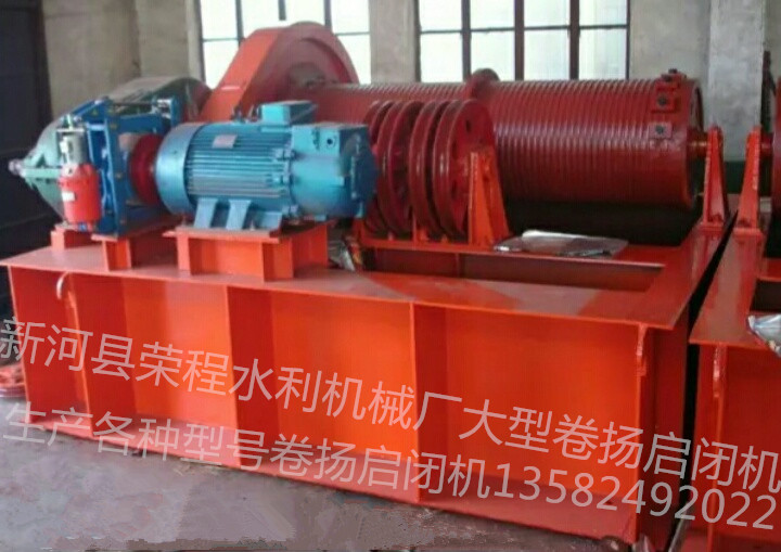 攔河閘用的卷揚式啟閉機用于攔河閘的啟閉,用于行水放水。卷揚式啟閉機是一種自動關(guān)閉的機械,是屬于一種新型的水利工程專用機械工具。它是用鋼索或鋼索滑輪組作吊具與閘門相連接,通過齒輪傳動系統(tǒng)使卷揚筒繞、放鋼索從而帶動升降的機械,也叫做鋼絲繩固定式卷揚機,構(gòu)造較簡單易于制造,維護檢修方便,廣泛應(yīng)用于各種類型閘門的啟閉。